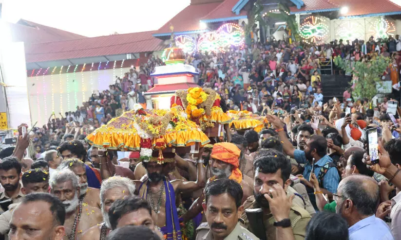 തിരുവാഭരണ ഘോഷയാത്ര ആറന്മുള പാർഥസാരഥി ക്ഷേത്രനടയിൽ എത്തിയപ്പോൾ