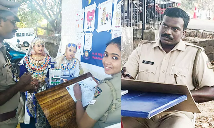 മിനിറ്റുകൾക്കുള്ളിൽ കാരിക്കേച്ചറും ‘മിറർ ഇമേജുമെല്ലാം’ ഒരുക്കിയാണ് പൊലീസ് കലോത്സവത്തെ ആഘോഷമാക്കുന്നത്. മലപ്പുറം ജില്ലയിൽ ജോലി ചെയ്യുന്ന തിരുവനന്തപുരം സ്വദേശിനിയായ ചിത്രകാരി സബൂറയും തൃശൂർ വെസ്റ്റിൽ ജോലി ചെയ്യുന്ന കൊല്ലം കരുനാഗപ്പള്ളി സ്വദേശി ഡോ. അനീഷ് ശിവാനന്ദുമാണ് കലോത്സവ നഗരിയെ ‘പൊലീസിന്റെ കലോത്സവം’ കൂടിയാക്കി മാറ്റുന്നത്.