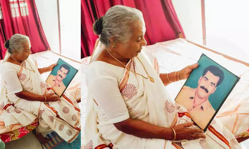 കൊയ്യം പാറക്കാടി കീയച്ചാലിലെ വീട്ടിൽ വിനോദിന്റെ ഫോട്ടോയുമായി മാതാവ് നാരായണി