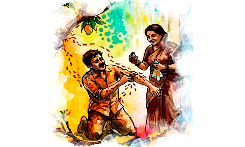 പുളിയുറുമ്പുകള് ഇളകി. അവര് ഒരു ഔചിത്യവുമില്ലാതെ എല്ലായിടത്തും ആക്രമിച്ചു തുടങ്ങി. കൈയിലും കാലിലും മുഖത്തും കടിച്ചതുവരെ സഹിച്ചു. സൈനികതാവളത്തില് ബോംബിടുംപോലെ കളസത്തിനുള്ളില് ആക്രമണമായി. അതോടെ സകലനിയന്ത്രണങ്ങളുംവിട്ട് താഴേക്കു പതിച്ചു. കാല്പാദത്തിലും മുട്ടിലും കൈവെള്ളയിലും നല്ല പരിക്കുകളേറ്റു. നെഞ്ചിലെ തൊലി പോയി. ലാടഗുരുവില്നിന്നു വൈദ്യം പഠിച്ച കുഞ്ഞേലിച്ചേടത്തിയെന്ന നാട്ടിലെ ചീഫ് ഫിസിഷ്യന് കം സര്ജനെ അമ്മാമ്മ ഉടന് വിളിപ്പിച്ചു. അവര് തൈലങ്ങളും മുറിവിനു പുരട്ടുന്ന മരുന്നുകളുമായി വന്നു. ‘‘മാന്റെ എവിടെയൊക്കെ കടിച്ചു’’ എന്ന് അവര് ചോദിക്കുമ്പോള് വീരസാഹസികദൗത്യം പരാജയപ്പെട്ടു വിഷണ്ണനായി നിന്നു. പരാജയത്തില് ആനന്ദം പൂണ്ട ഒരു വെകിടനായ കസിന് കളസത്തിലേക്കു ചൂണ്ടിക്കാട്ടി കുഞ്ഞേലിച്ചേടത്തിയോട് അവന്റെ മിഡില് സ്റ്റമ്പില്വരെ കടികിട്ടി എന്നു പറഞ്ഞുകൈ കൊട്ടി ചിരിച്ചു.