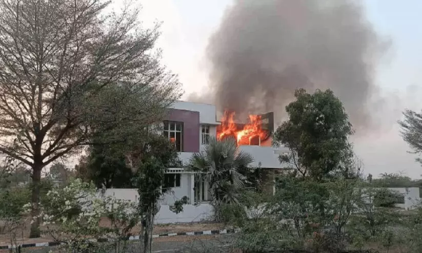 ബെള്ളാരിയില് ബി.ജെ.പി നേതാക്കളായ ജി. ജനാര്ദനറെഡ്ഡി എം.എല്.എയുടെയും ബി. ശ്രീരാമലുവിന്റെയും ഉടമസ്ഥതയിലുള്ള മാതൃകാവീടിന് തീപിടിച്ചപ്പോൾ