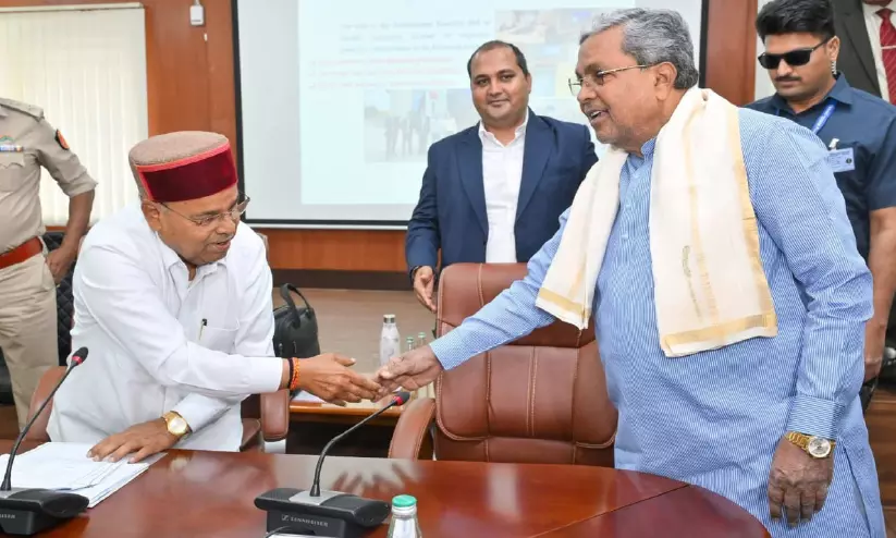 വൈസ് ചാൻസലർമാരുടെ സമ്മേളന വേദിയിൽ മുഖ്യമന്ത്രി സിദ്ധരാമയ്യ ഗവർണർ തവാർചന്ദ് ഗെഹ് ലോട്ടിനെ ഹസ്തദാനം ചെയ്യുന്നു