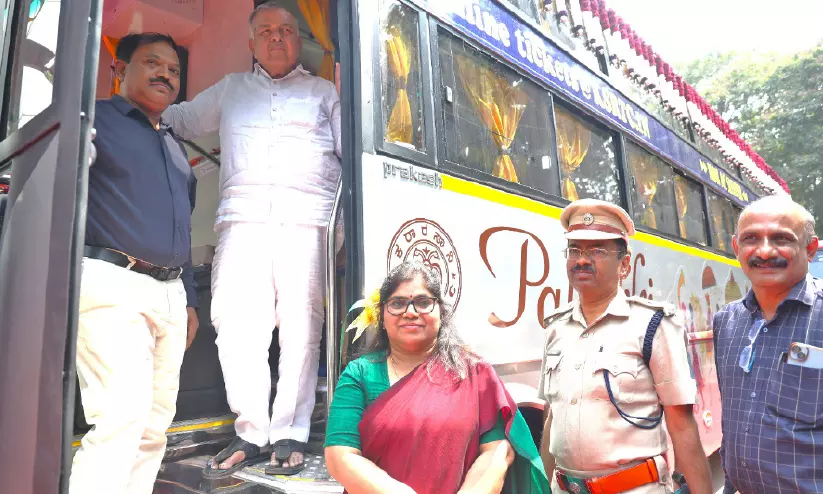 കെ.എസ്.ആർ.ടി.സി കേന്ദ്ര ഓഫിസിൽ ഗതാഗത മന്ത്രി രാമലിംഗ റെഡ്ഡി പല്ലക്കി ബസുകള് പരിശോധിക്കുന്നു