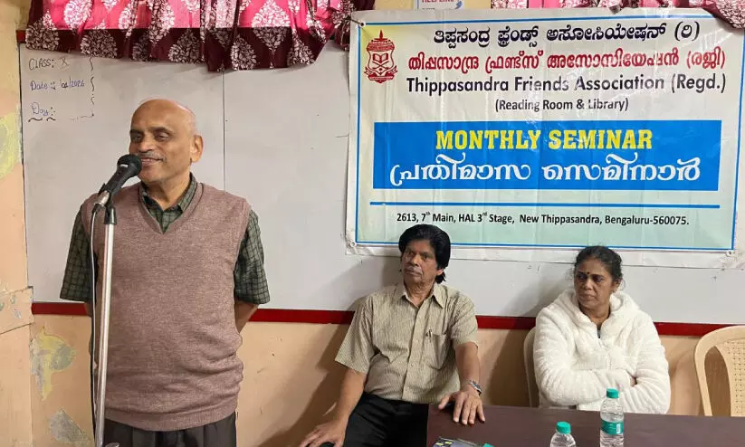 തിപ്പസാന്ദ്ര ഫ്രണ്ട്സ് അസോസിയേഷന്റെ നേതൃത്വത്തില് നടന്ന പ്രതിമാസ സെമിനാറില് ഡോ. ശങ്കരൻ മണിപ്പുഴ സംസാരിക്കുന്നു