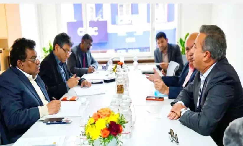 ലോക സാമ്പത്തിക ഫോറത്തിൽ യു.പി.എൽ ചെയർമാൻ ആൻഡ് സി.ഇ.ഒ ജയ് ഷ്റോഫും വ്യവസായ മന്ത്രി എം.ബി. പാട്ടീലും കൂടിക്കാഴ്ചയിൽ