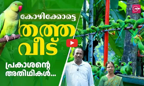 ഈ തത്തകൾ ഇവിടെ അതിഥികളായതിനു പിന്നിലൊരു കഥയുണ്ട്. മണികുട്ടിയെന്ന് പേരിട്ടു വിളിച്ച, കൂട്ടിലിട്ടു വളർത്തിയ ഓരോമന തത്തയുണ്ടായിരുന്നു പ്രകാശന്. മണികുട്ടിക്ക് ഭക്ഷണം കൊടുക്കുന്നത് കണ്ട് പിന്നെ ഓരോ തത്തകളായി വന്നു തുടങ്ങി. അവർക്ക് കൂടി പ്രകാശൻ അന്നംകൊടുത്തു. പെട്ടന്ന് മണികുട്ടിയെ കാണാതായി. അപ്പോഴും ബാക്കിയുള്ളവർക്ക് ഭക്ഷണം നൽകാൻ അയാൾ മറന്നില്ല. അങ്ങനെ പിന്നെ അതൊരു ശീലമായി. സന്തോഷമായി. പതിവുതെറ്റാതെ എന്നും എത്തുന്ന ഈ പനം തത്തകൾക്ക് കൂട്ടത്തിൽ മണികുട്ടിയുമുണ്ടെന്നാണ് പ്രകാശന്റെ വിശ്വാസം.പ്രകാശന്റെ അതിഥികൾ... ഇത് കോഴിക്കോട്ടെ തത്ത വീട് |