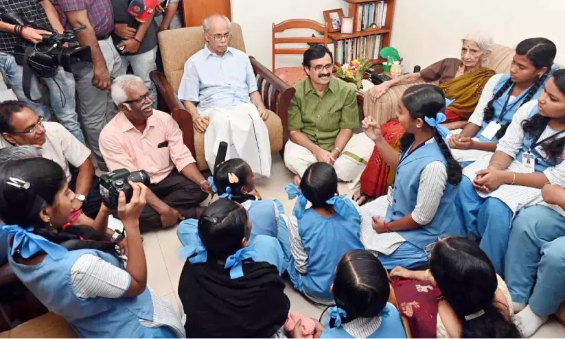 പൊതുവിദ്യാഭ്യാസ വകുപ്പ് നടത്തിയ ‘വിദ്യാലയം പ്രതിഭകളിലേക്ക്’ പദ്ധതിയുടെ ഭാഗമായി കുട്ടികൾ കെ.എൻ. പണിക്കറെ സന്ദർശിച്ചപ്പോൾ. പത്നി ഉഷ ഭാർഗവ, അന്നത്തെ വിദ്യാഭ്യാസ മന്ത്രി പ്രഫ. സി. രവീന്ദ്രനാഥ് എന്നിവരെയും കാണാം