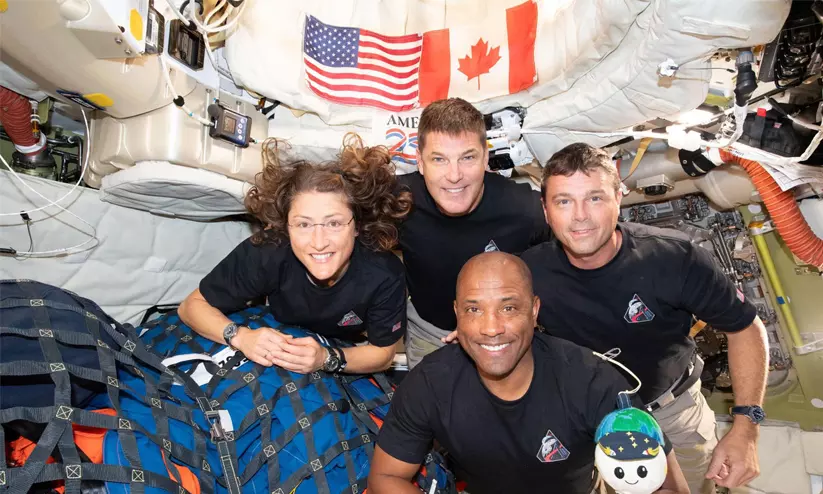 മടക്കയാത്രയ്ക്കിടയിൽ ക്രിസ്റ്റീന കോക്ക്, ജെറമി ഹാൻസൻ, കമാൻഡർ റീഡ് വൈസ്മാൻ, പൈലറ്റ് വിക്ടർ ഗ്ലോവർ ഓറിയോൺ പേടകത്തിനുള്ളിൽ നിന്നുളള ദൃശ്യം