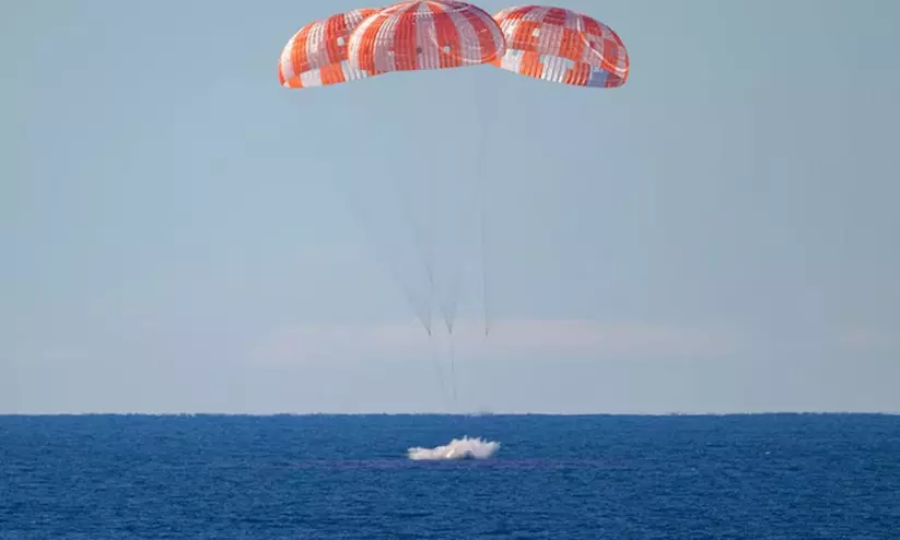 മണിക്കൂറിൽ 40,000 കിലോമീറ്റർ വേഗത്തിലാണ് ഓറിയോൺ പേടകം ഭൂമിയുടെ അന്തരീക്ഷത്തിലേക്ക് പ്രവേശിച്ചത്. ദൗത്യത്തിന്റെ അവസാനഘട്ടത്തിൽ പേടകത്തിന്റെ ക്രൂ കാപ്സ്യൂൾ വേർപെട്ട് ഭൂമിയുടെ അന്തരീക്ഷത്തിലേക്ക് തീഗോളമായി പ്രവേശിച്ചു. പിന്നാലെ പാരച്യൂട്ടുകളുടെ സഹായത്തോടെ പേടകം കടലിലേക്കു പതിച്ചു. അന്തരീക്ഷത്തിൽ പ്രവേശിക്കുന്നതു തൊട്ട് സമുദ്രപതനം വരെ 15 മിനിറ്റ് സമയമാണു വേണ്ടിവന്നത്.