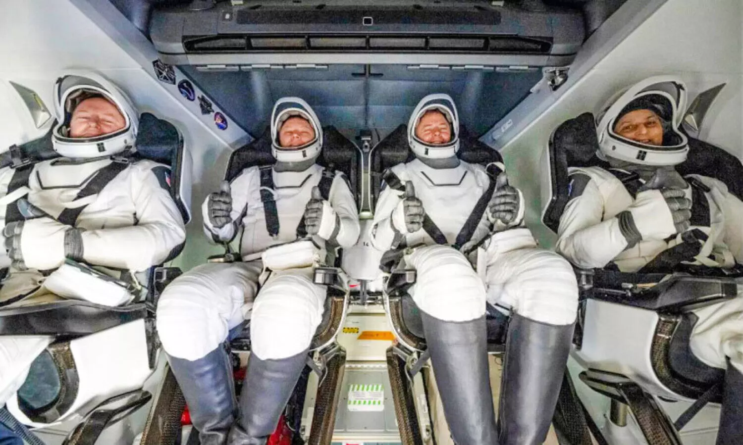 ഡ്രാഗൺ പേടകം കടലിൽ പതിച്ചപ്പോൾ പേടകത്തിനുള്ളിൽനിന്നുള്ള ദൃശ്യം. നാല് യാത്രികരും പുറത്തിറങ്ങാനുള്ള തയാറെടുപ്പിൽ