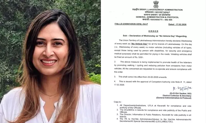 ലക്ഷദ്വീപിൽ ആരോഗ്യ സംരക്ഷണവും പരിസ്ഥിതി സൗഹൃദ ജീവിതശൈലിയും പ്രോത്സാഹിപ്പിക്കുന്നതിനായി ആഴ്ചയിലൊരിക്കൽ വാഹന നിയന്ത്രണം ഏർപ്പെടുത്തിക്കൊണ്ടാണ് ഭരണകൂടം ഉത്തരവിറക്കിയത്. എല്ലാ ബുധനാഴ്ചകളും 'നോ വെഹിക്കിൾ ഡേ' ആയി ആചരിക്കാനാണ് തീരുമാനം.