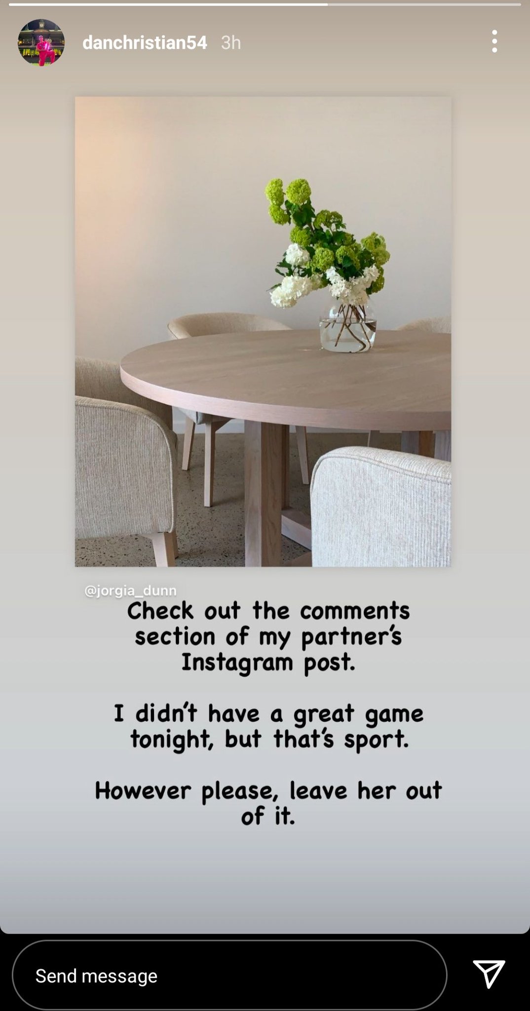 സൈബർ ആക്രമണത്തിന് പിന്നാലെ ഡാനിയൽ ക്രിസ്റ്റ്യൻ പോസ്റ്റ് ചെയ്തതിങ്ങനെ: '' എന്റെ പങ്കാളിയുടെ ഇൻസ്റ്റ ഗ്രാം പോസ്റ്റിലുള്ള കമന്റുകൾ നോക്കൂ. ഞാൻ ഇന്നലെ നന്നായി കളിച്ചില്ലെന്നത് ശരിയാണ്. പക്ഷേ എന്റെ ഭാര്യയെ ഇതിൽ നിന്നൊഴിവാക്കൂ''.