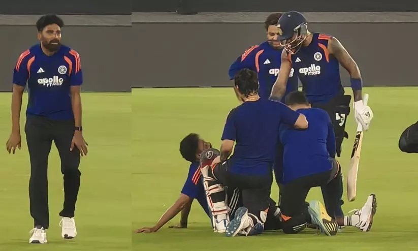 നരേന്ദ്രമോദി സ്റ്റേഡിയത്തിൽ പരിശീലിക്കുന്നതിനിടെയായിരുന്നു സംഭവം. പാണ്ഡ്യയുടെ പവർഹിറ്റ് ഷോട്ടിൽ പന്ത് പതിച്ചത് ഫീൽഡിൽ നിൽക്കുകയായിരുന്നു സിറാജിന്റെ കാൽമുട്ടിൽ. ഒഴിഞ്ഞുമാറും മുമ്പേ പന്ത് കൊണ്ട സിറാജ് വേദനയിൽ നിലത്തിരിക്കുന്നതും പണ്ഡ്യ ഉൾപ്പെടെ സഹതാരങ്ങളും ഫിസിയോയും എത്തി പരിചരിക്കുന്നതും ദൃശ്യങ്ങളിൽ കാണാം.