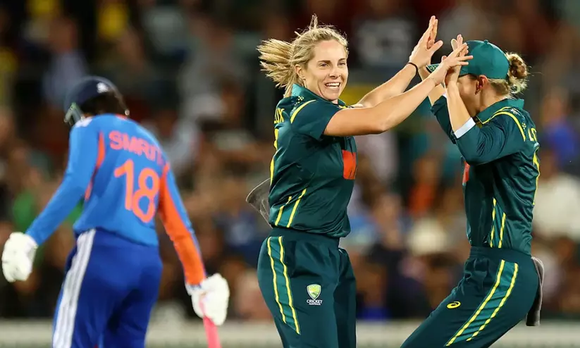 ഒന്നാം വിക്കറ്റിൽ 14.5 ഓവറിൽ 128 റൺസാണ് ഇരുവരും അടിച്ചെടുത്തത്. പിന്നീട് വന്നവർക്കൊന്നും ക്രീസിൽ നിലയുറപ്പിക്കാനായില്ല. ഫൊയെബി ലിച്ച്ഫീൽഡ് (അഞ്ചു പന്തിൽ ആറ്), എല്ലിസി പെരി (10 പന്തിൽ ഏഴ്), ജോർജിയ വരെഹാം (പൂജ്യം) എന്നിവരാണ് പുറത്തായ മറ്റു താരങ്ങൾ. ആഷ്ലി ഗാർഡ്നർ ഒമ്പത് പന്തിൽ 10 റൺസുമായി പുറത്താകാതെ നിന്നു. ഇന്ത്യക്കായി അരുന്ദതി റെഡ്ഡി രണ്ടു വിക്കറ്റെടുത്തു. മറുപടി ബാറ്റിങ്ങിൽ ഷെഫാലി വർമയും സ്മൃതി മന്ദാനയും ഇന്ത്യക്ക് മികച്ച തുടക്കം നൽകിയെങ്കിലും പിന്നാലെ ക്രീസിലെത്തിയവരിൽ ക്യാപ്റ്റൻ ഹർമൻപ്രീത് കൗറിനു മാത്രമാണ് പിടിച്ചുനിൽക്കാനായത്. ഷെഫാലി 23 പന്തിൽ 29 റൺസും മന്ദാന 24 പന്തിൽ 31 റൺസും എടുത്താണ് പുറത്തായത്. ഒന്നാം വിക്കറ്റിൽ 6.4 ഓവറിൽ 57 റൺസിന്റെ കൂട്ടുകെട്ടുണ്ടാക്കിയാണ് ഇരുവരും പിരിഞ്ഞത്.