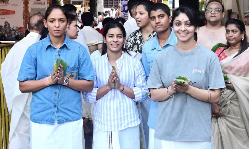 ഇന്ത്യൻ ക്യാപ്റ്റൻ ഹര്മന് പ്രീത് കൗര്, സഹതാരങ്ങളായ വൈഷ്ണവി ശര്മ, അമന്ജോത് കൗര്, റിച്ച ഘോഷ്, ഹര്ലീൻ ഡിയോള് എന്നിവർക്കൊപ്പം തിരുവനന്തപുരം പത്മനാഭസ്വാമി ക്ഷേത്രത്തില് ദര്ശനം നടത്തിയ ശേഷം പുറത്തേക്കു വരുന്നു - വൈ.ആർ. വിപിൻദാസ്