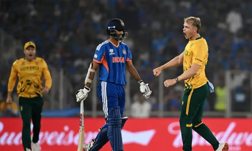 ഞെട്ടിക്കുന്ന തുടക്കമാണ് ഇന്ത്യക്ക് ഉണ്ടായത്. സ്കോർബോർഡിൽ റണ്ണെത്തുമ്പോഴേക്കും ഇഷാൻ കിഷൻ വീണു. മാക്രത്തിനായിരുന്നു വിക്കറ്റ്. പിന്നാലെ തിലക് വർമ്മയും (1) അഭിഷേക് ശർമ്മയും(15) വീണതോടെ ഇന്ത്യയുടെ നില പരുങ്ങലിലായി. വാഷിങ്ടൺ സുന്ദർ(11) വന്നപോലെ മടങ്ങി. സൂര്യകുമാർ യാദവിനും (18) ഹാർദിക് പാണ്ഡ്യക്കും (18) ഒന്നും ചെയ്യാൻ കഴിഞ്ഞില്ല. ഒരറ്റത്ത് ദുബെ പിടിച്ചുനിന്നുവെങ്കിലും പിന്തുണ നൽകാൻ ആരുമുണ്ടായില്ല. ഒടുവിൽ 18.5 ഓവറിൽ 111 റൺസിന് ഇന്ത്യൻ പോരാട്ടം അവസാനിച്ചു.