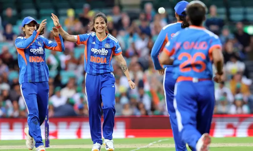 ഇന്ത്യൻ ബൗളർ രേണുക സിങ് താക്കൂർ സഹതാരം ശ്രേയങ്ക പാട്ടിലിനൊപ്പം വിക്കറ്റ് ആഘോഷത്തിൽ