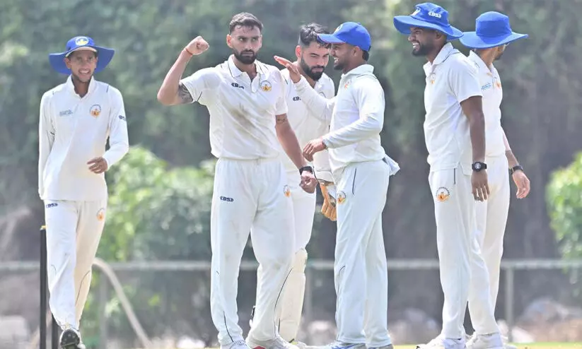 ടോസ് നേടി ബാറ്റിങ് തെരഞ്ഞെടുത്ത കേരളത്തിനായി ഒന്നാം ഇന്നിങ്സിൽ സചിൻ ബേബിയും (110 പന്തിൽ 41) ബാബാ അപരാജിതും (107 പന്തിൽ 49) എന്നിവർ മാത്രമാണ് ഭേദപ്പെട്ട പ്രകടനം പുറത്തെടുത്തത്. കേരളത്തിന് രണ്ടാം ഓവറിൽതന്നെ ഓപണർ അഭിഷേക് ജെ. നായരെ (1) നഷ്ടമായി. കാർത്തിക് സന്ദിലിന്റെ പന്തിൽ വിഷ്ണുവിന് ക്യാച്ച് നൽകിയാണ് അഭിഷേക് മടങ്ങിയത്. വൈകാതെ 14 റൺസെടുത്ത എ.കെ. ആകർഷിനെ രോഹിത് ധന്ദ ക്ലീൻ ബൗൾഡാക്കി. തുടർന്ന് സച്ചിൻ ബേബി- ബാബ അപരാജിത് സഖ്യം പ്രതീക്ഷ നൽകി. ഉച്ചഭക്ഷണത്തിന് പിരിയുമ്പോൾ രണ്ട് വിക്കറ്റ് നഷ്ടത്തിൽ 87 റൺസ് എന്ന നിലയിലായിരുന്നു. കളി പുനരാരംഭിച്ച് വൈകാതെ സച്ചിനും (41) വിഷ്ണു വിനോദും (0) പുറത്തായി. രോഹിത് ധന്ദയുടെ പന്തിൽ ഇരുവരും എൽ.ബി.ഡബ്ല്യു ആവുകയായിരുന്നു. അർധ സെഞ്ച്വറിക്ക് തൊട്ടരികെ അപരാജിതും (49) മടങ്ങി. വെറും എട്ട് പന്തുകൾക്കിടെ മൂന്ന് വിക്കറ്റുകൾകൂടി നഷ്ടമായതോടെ കേരളത്തിന്റെ തകർച്ച പൂർണം.