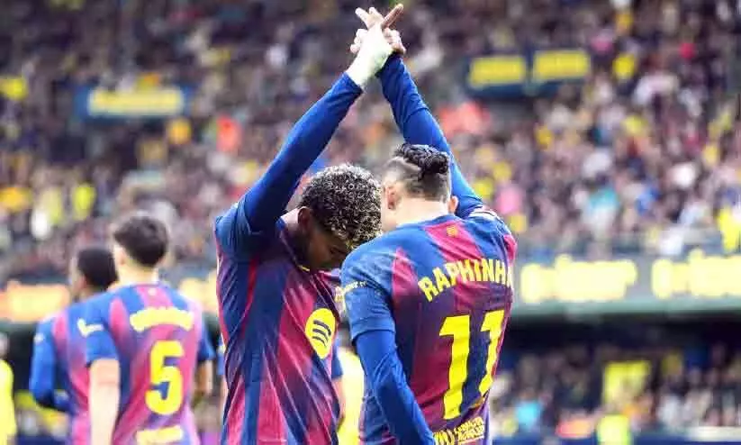 വിയ്യ റയലിനെതിരായ ഗോൾ ആഘോഷിക്കുന്ന ബാഴ്സലോണയുടെ ലമീൻ യമാലും റഫിഞ്ഞയും