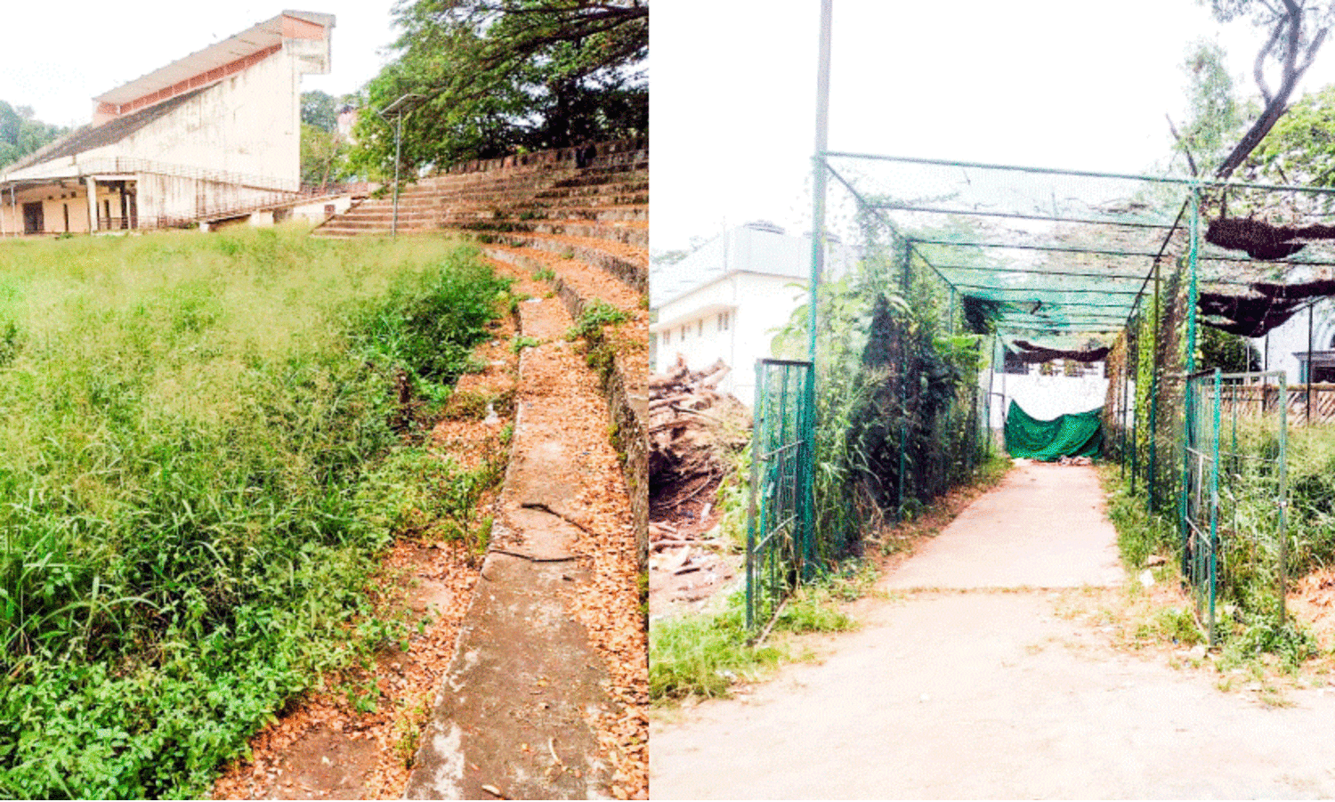 നാഗമ്പടം സ്റ്റേഡിയത്തിലെ ട്രാക്കിന് ചുറ്റും പുല്ലുകൾ വളർന്ന നിലയിൽ, സ്റ്റേഡിയത്തിന് മുന്നിലെ ക്രിക്കറ്റ് നെറ്റ്സ്