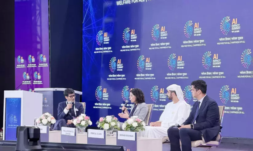 ന്യൂഡൽഹിയിൽ നടന്ന ‘എ.ഐ ഇംപാക്ട് സമ്മിറ്റി’ലെ സെഷനിൽ പങ്കെടുക്കുന്ന യു.എ.ഇ ആർട്ടിഫിഷ്യൽ ഇന്റലിജൻസ്, ഡിജിറ്റൽ ഇക്കണോമി, റിമോട്ട് വർക്ക് ആപ്ലിക്കേഷൻസ് സഹമന്ത്രി ഉമർ സുൽത്താൻ അൽ ഉലമ