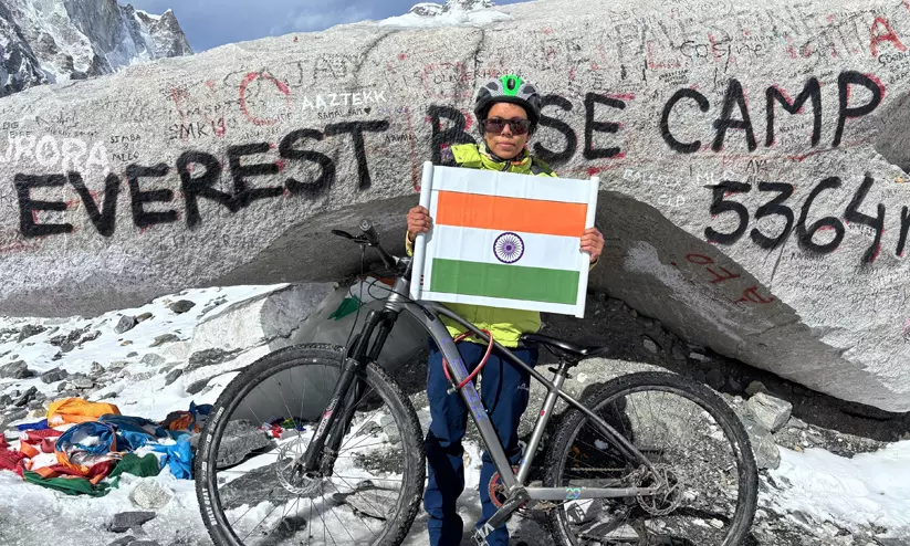 ന്യൂഡൽഹി: പ്രതികൂല കാലാവസ്ഥയും അതികഠിനമായ ഭൂപ്രകൃതിയെയും അതിജീവിച്ച് എവറസ്റ്റ് ബേസ് ക്യാമ്പിലേക്ക് സൈക്കിൾ ചവിട്ടിക്കയറി ഉത്തർപ്രദേശ് സ്വദേശിയായ യുവതി. ഉത്തർപ്രദേശ് ഗൊരഖ്പൂരിൽനിന്നുള്ള ദിവ്യ സിങ്ങാണ് 14 ദിവസത്തെ കഠിന യാത്ര പൂർത്തിയാക്കി നേട്ടം കൈവരിച്ചത്. കാഠ്മണ്ഡുവിൽനിന്നാണ് ദിവ്യ സിങ് എവറസ്റ്റ് ബേസ് ക്യാമ്പ് വരെ സൈക്കിൾ ചവിട്ടിയത്. തണുത്ത കാറ്റിനെയും പ്രതികൂലമായ കാലാവസ്ഥയെയും അതിജീവിച്ച് കുറഞ്ഞുവരുന്ന ഓക്സിജൻ അളവിനെയും വകവെക്കാതെ ദുർഘട പാതകളെ മറികടന്നായിരുന്നു ദിവ്യയുടെ യാത്ര.