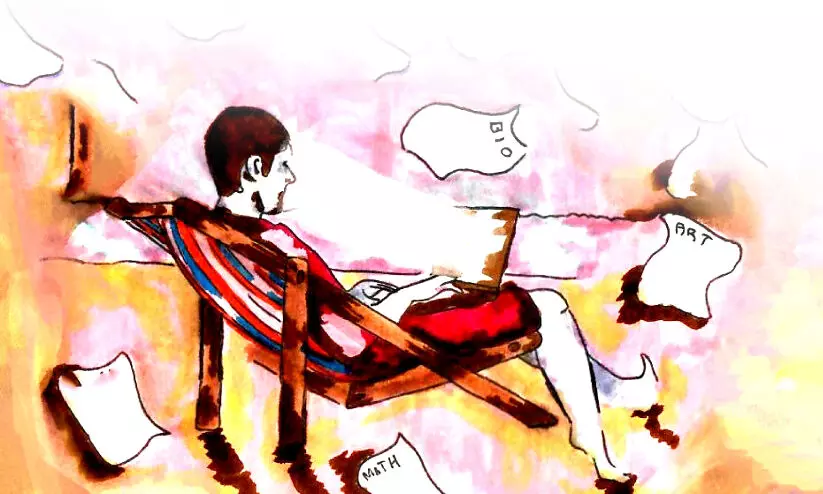 അഞ്ചാംതരത്തിൽ പഞ്ചാരമണലിൽ അപ്പൂപ്പൻതാടി തുന്നുമ്പോൾ അമ്മയോർമിപ്പിച്ചു; പത്തിലെ ഫുൾ ഏ പ്ലസ്! ഏഴാംക്ലാസിൽ പകൽപ്പൂരത്തിന്റെ മൈതാനത്ത് കാറ്റാടി പറത്തുമ്പോൾ അച്ഛൻ കടുപ്പിച്ചു, പത്തിൽ ‘പത്ത്’. ഒമ്പതിന്റെ നൊസ്റ്റാൾജിയപ്പുറത്ത് കാർട്ടൂൺ നെറ്റ് വർക്കിൽ കുരുങ്ങിക്കിടന്നപ്പോൾ ടീച്ചർമാർ കണ്ണുരുട്ടി അടുത്തകൊല്ലത്തെ ഫ്ലക്സ്ബോർഡ്! ‘പത്തിന്’ പത്തടി ദൂരത്തിൽ പനിച്ച് നിന്ന് പേടിച്ചപ്പോൾ കണക്കിനൊരേപ്ലസ്- ട്യൂഷൻമാഷ് പുലമ്പി. ഉറക്കപ്പായ ചുരുട്ടി വിശന്നവയറ്റത്തടിച്ച് മോണിങ് ക്ലാസ്. മടുത്ത് ചെടിച്ച് ഇഴഞ്ഞ് വലിഞ്ഞൊരീവനിങ്... നൈറ്റ്ക്ലാസിലോ നക്ഷത്രങ്ങൾ നിലാചാപം വീശി കിനാവിന്റെ...