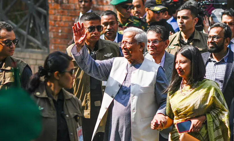 ധാക്കയിൽ വോട്ട് ചെയ്ത് പുറത്തിറങ്ങുന്ന, ബംഗ്ലാദേശ് സർക്കാറിന്റെ മുഖ്യ ഉപദേഷ്ടാവ് മുഹമ്മദ് യൂനുസും പത്നിയും