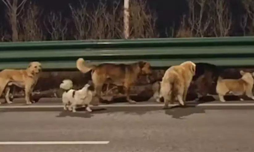 ഇറച്ചി വിൽക്കുന്ന കടയിലേക്ക് കൊണ്ടുപോകുന്നതിനിടെ കശാപ്പുശാലയിൽ നിന്നോ ട്രക്കിൽ നിന്നോ രക്ഷപ്പെട്ട ഇവ ഹൈവേയിലൂടെ തോളോടുതോൾ ചേർന്ന് നടന്നുനീങ്ങുന്ന ദൃശ്യങ്ങൾ ഇതിനോടകം കോടിക്കണക്കിന് ആളുകളാണ് കണ്ടത്. അപകടത്തിൽപ്പെട്ട് പരിക്കേറ്റ ജർമ്മൻ ഷെപ്പേർഡിന് ചുറ്റും കാവലായി മറ്റു നായ്ക്കൾ നിൽക്കുന്നതും കൂട്ടം തെറ്റുന്നുണ്ടോ എന്ന് പരിശോധിക്കാൻ കോർഗി ഇനത്തിൽപ്പെട്ട നായ ഇടയ്ക്കിടെ തിരിഞ്ഞു നോക്കുന്നതും ദൃശ്യങ്ങളിൽ വ്യക്തമാണ്. ഗോൾഡൻ റിട്രീവർ, ലാബ്രഡോർ, പെക്കിംഗീസ് തുടങ്ങിയ ഇനങ്ങളാണ് ഈ സംഘത്തിലുണ്ടായിരുന്നത്.
