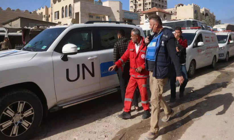 ഗസ്സ അതിർത്തിയിൽ പരിക്കേറ്റവരെ കൊണ്ടുപോവുന്ന വാഹനങ്ങൾക്ക് മാർഗ നിർദേശം നൽകുന്ന ആരോഗ്യ പ്രവർത്തകർ