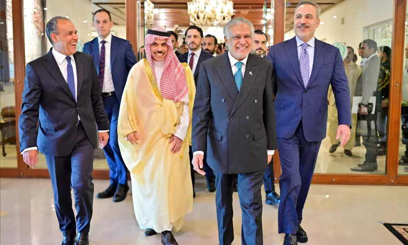 ഇസ്ലാമാബാദിൽ പശ്ചിമേഷ്യയിലെ സമാധാന ശ്രമങ്ങളെക്കുറിച്ച് ചർച്ച ചെയ്യാനെത്തുന്ന വിദേശകാര്യ മന്ത്രിമാരായ ഹകൻ ഫിദാൻ (തുർകിയ), ഫൈസൽ ബിൻ ഫർഹാൻ (സൗദി അറേബ്യ), ബദ്ർ അബ്ദുൽ ആത്വി (ഈജിപ്ത്), ഇസ്ഹാഖ് ദാർ (പാകിസ്താൻ) എന്നിവർ