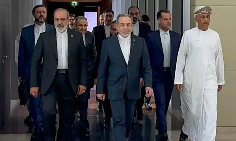 മസ്കത്തിൽ അമേരിക്കയുമായുള്ള ചർച്ചക്ക് ഇറാൻ വിദേശ മന്ത്രി അബ്ബാസ് അറഗ്ചിയുടെ (മധ്യത്തിൽ) നേതൃത്വത്തിലുള്ള സംഘം എത്തിയപ്പോൾ