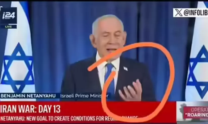 തെൽഅവീവ്: ഇറാൻ- ഇസ്രായേൽ യുദ്ധം അതിരൂക്ഷമായി തുടരുന്നതിനിടെ ഇസ്രായേൽ പ്രധാനമന്ത്രി ബെഞ്ചമിൻ നെതന്യാഹുമായി ബന്ധപ്പെട്ട് വിവാദം കൊടുംപിരികൊള്ളുകയാണ് സമൂഹ മാധ്യമങ്ങളിൽ. നെതന്യാഹു ഇറാൻ പ്രത്യാക്രമണത്തിൽ കൊല്ലപ്പെട്ടുഎന്ന് സമൂഹ മാധ്യമങ്ങളിൽ അഭ്യൂഹം പരിക്കുന്നതിനിടെ അദ്ദേഹം രാജ്യത്തെ അഭിസംബോധന ചെയ്യുന്നതായി പുറത്തുവന്ന വീഡിയോ ആണ് പുതിയ വിവാദത്തിന് തിരികൊളുത്തിയിരിക്കുന്നത്. വീഡിയോ ഒറിജിനൽ അല്ലെന്നും എ.ഐ നിർമിതമാണെന്നുമാണ് സോഷ്യൽ മീഡിയയുടെ കണ്ടുപിടിത്തം. തങ്ങളുടെ വാതത്തിന് തെളിവായി പരിപാടിയുടെ സ്ക്രീൻ ഷോട്ടും സോഷ്യൽ മീഡിയയിൽ വ്യാപകമായി പ്രചരിക്കുന്നുണ്ട്. സ്ക്രീൻ ഷോട്ടിലെ നെതന്യാഹുവിന്റെ കൈയിൽ ആറു വിരലുകളുണ്ടെന്നും മറ്റ് സാങ്കേതിക പ്രശ്നങ്ങളുണ്ടെന്നും വിമർശകർ പറയുന്നു.