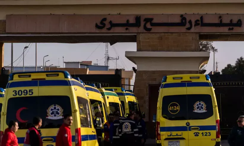 റഫ അതിർത്തിയിൽ കാത്തുനിൽക്കുന്ന ആംബുലൻസുകൾ