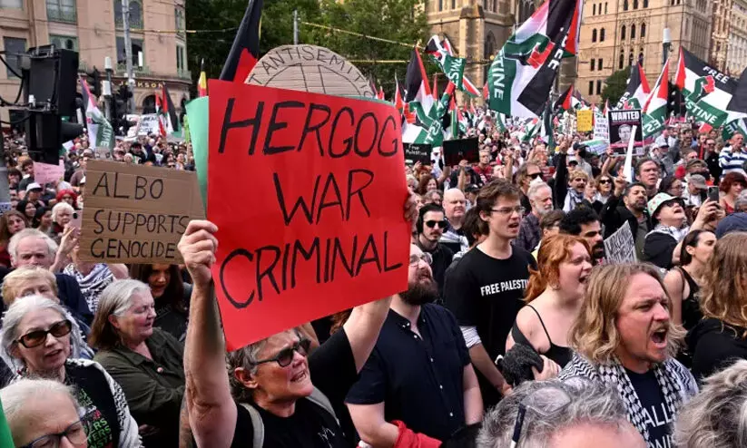 മെൽബൺ: ഇസ്രായേൽ പ്രസിഡന്റ് ഇസാക് ഹെർസോഗിന്റെ വിവാദമായ നാലുദിവസത്തെ ആസ്ട്രേലിയൻ സന്ദർശനം അവസാനിച്ചതോടെ ആസ്ട്രേലിയയിൽ വൻ പ്രക്ഷോഭം. ഗസ്സയിലെ മനുഷ്യക്കുരുതിയിൽ പ്രതിഷേധിച്ച് മെൽബണിൽ പതിനായിരങ്ങൾ പങ്കെടുത്ത പ്രതിഷേധം അരേങ്ങറി. ഹെർസോഗിനെ യുദ്ധക്കുറ്റവാളിയായി പ്രഖ്യാപിച്ചായിരുന്നു പ്രക്ഷോഭം. എന്നാൽ പ്രക്ഷോഭം തികച്ചും ശാന്തമായിരുന്നു.