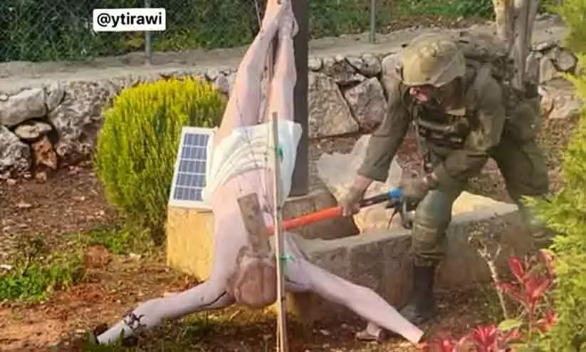 ലബനാനിൽ ഇസ്രായേൽ സൈനികൻ യേശുവിന്റെ പ്രതിമ തകർക്കുന്നു photo: x.com/ytirawi/
