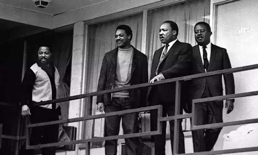 മാർട്ടിൻ ലൂഥർ കിങ് ജൂനിയർ (വലത്തുനിന്ന് രണ്ടാമത്) കൊല്ലപ്പെടുന്നതിന് തലേദിവസം ജെസ്സി ജാക്സനൊപ്പം (ഇടത്തുനിന്ന് രണ്ടാമത്)