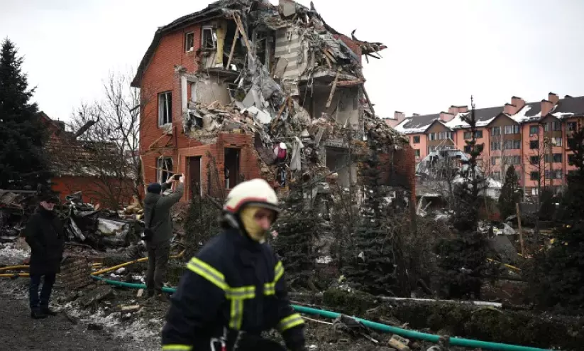 യുക്രെയ്നിലെ കിയവിൽ റഷ്യൻ വ്യോമാക്രമണത്തിൽ തകർന്ന കെട്ടിടത്തിന് സമീപം രക്ഷാപ്രവർത്തനം നടത്തുന്നവർ