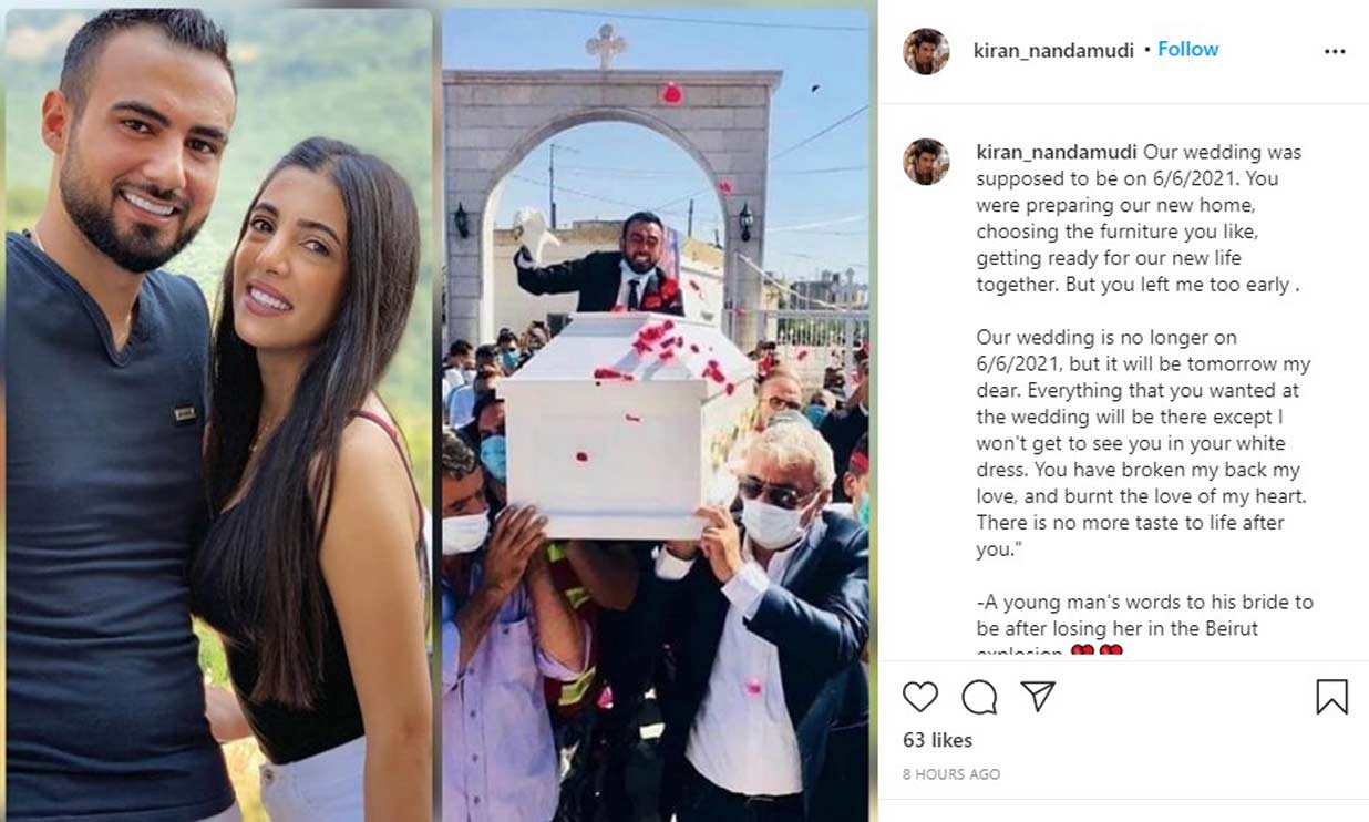 'എെൻറ മനോഹരിയായ വധു. 2021 ജൂൺ ആറിന് ഞങ്ങൾ വിവാഹിതരാകാനിരുന്നതായിരുന്നു. പകരം നാളെയത് നടക്കും'- ലെബനീസ് സ്റ്റേറ്റ് സെക്യൂരിറ്റിയിൽ ഓഫിസറായ കരാൻ, സഹറിെൻറ മരണത്തിന് പിന്നാലെ ഓൺലൈൻ സന്ദേശത്തിൽ എഴുതി. പാരാമെഡിക് യൂനിഫോമിൽ സഹർ പുഞ്ചിരിച്ച് നിൽക്കുന്ന പടത്തിനൊപ്പമായിരുന്നു സന്ദേശം.
