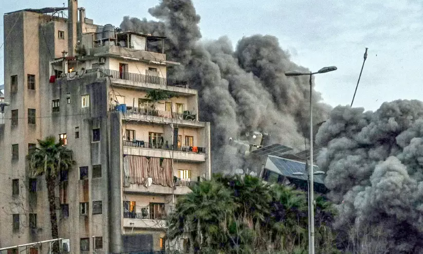 ലബനാൻ തലസ്ഥാനമായ ബൈറൂത്തിലെ ബാശൂറയിൽ ബുധനാഴ്ച ഇസ്രായേൽ വ്യോമാക്രമണത്തിൽ ബഹുനില കെട്ടിടം തകർന്നുവീഴുമ്പോൾ പുകയും പൊടിപടലങ്ങളും ഉയർന്നുപൊങ്ങുന്നു.
