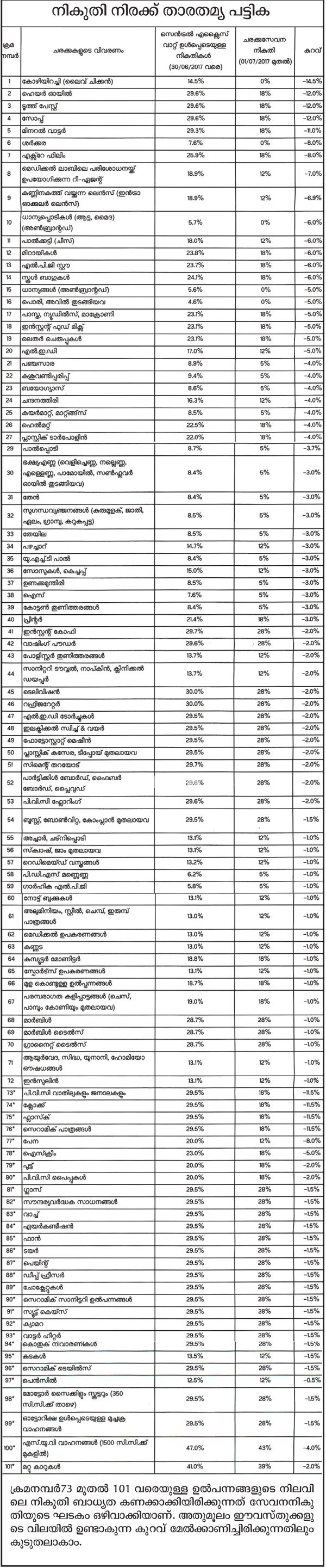 യഥാർഥത്തിൽ നേരേത്ത നൽകിയിരുന്ന നികുതികളും മറ്റും കുറച്ചുള്ള വിലയ്ക്കാണ് ജി.എസ്.ടി വരുന്നത്. എന്നാൽ, അത്തരം നികുതികൾ കുറക്കാതെ ആകെ വിലയുടെ മുകളിൽ ജി.എസ്.ടി ചുമത്തുകയാണ് ചെയ്യുന്നത്. കോഴിയുടെ 14.5 ശതമാനം വാറ്റ് ഇല്ലാതായിട്ടും വില കുറഞ്ഞില്ല. ചില വസ്ത്രശാലകളാകെട്ട ഇളവ് കൊടുക്കാതിരിക്കാൻ വിലയുടെ സ്റ്റിക്കർ മാറ്റി ഒട്ടിച്ചു. സർക്കാർ തിയറ്ററുകൾ പോലും നിരക്ക് വർധിപ്പിച്ചു.
