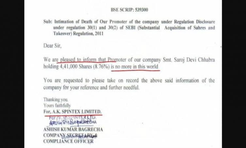 എ.കെ സ്പിൻടെക്സ് എന്ന ടെക്സ്റ്റൈൽ കമ്പനിയാണ് ബോംബെ സ്റ്റോക്ക് എക്സ്ചേഞ്ചിൽ ഇത്തരമൊരു അറിയിപ്പ്. കമ്പനിയുടെ 8.76 ശതമാനം ഓഹരികളുടെ ഉടമയായ സരോജ് ദേവി ചാബ്രയുടെ മരണം സന്തോഷത്തോടെ അറിയിക്കുന്നുവെന്ന് കമ്പനി വ്യക്തമാക്കിയിരിക്കുന്നത്.