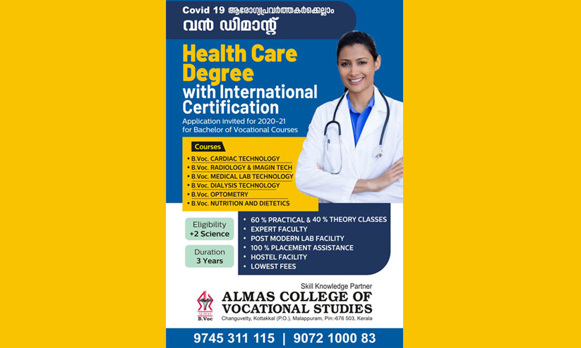 കോവിഡ് ഇനിയും പടർന്നുകൊണ്ടേയിരിക്കും എന്ന് ആരോഗ്യ വിദഗ്ധർ പറയുമ്പോൾ അതിനെ നിയന്ത്രിക്കാനുള്ള ആരോഗ്യ പ്രവർത്തകരുടെ എണ്ണക്കുറവിലാണ് ബന്ധപ്പെട്ടവർക്ക് ആശങ്ക കൂടുതൽ. ഹൈൽത്ത് കെയർ കോഴ്സകൾക്കും മറ്റും കേരളത്തിന് പുറത്തേക്ക് പോയിരുന്ന പ്രവണതയും കോവിഡ് മൂലം തടസ്സപ്പെട്ടു. സാഹചര്യം ആവശ്യപ്പെടുന്ന വൻ ഡിമാൻറിനും വിദ്യാർഥികളുടെ സ്വപ്നത്തിനും പരിഹാരമാകുകയാണ് കോട്ടക്കൽ അൽമാസ് ഹോസ്പിറ്റൽ.