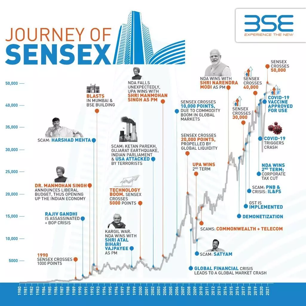 1990 കളിൽ 1000 പോയിന്റിലായിരുന്നു സെൻസെക്സിന്റെ വ്യാപാരം. ഇതിനിടെ ക്രമാനുഗതമായ ഉയർച്ച രേഖപ്പെടുത്തിയ ഓഹരി വിപണി ചില ഘട്ടങ്ങളിൽ പ്രതിസന്ധിയേയും അഭിമുഖീകരിച്ചു. അധികാരമാറ്റങ്ങളും ഉദാര സാമ്പത്തിക നയങ്ങളും സാങ്കേതിക മേഖലയിലെ വിപ്ലവുമെല്ലാം സെൻസെക്സിന്റെ ഉയർച്ചയെ സ്വാധീനിച്ചു. എന്നാൽ, ഭീകരാക്രമണങ്ങളും തട്ടിപ്പുകളും സർക്കാറിന്റെ നയങ്ങളും വിപണിയുടെ തിരിച്ചടിക്കും കാരണമായി.