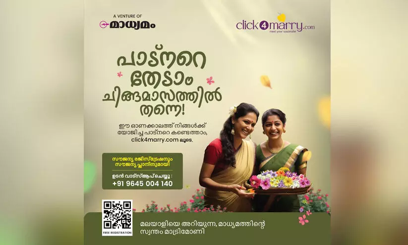 ഈ ഓണക്കാലത്ത് പുതുപുത്തൻ ഓഫറുകളുമായാണ് ‘Click4Marry’ നിങ്ങളിലേക്കെത്തുന്നത്. ഉടൻ രജിസ്റ്റർ ചെയ്യുന്ന പ്രൊഫൈലുകാർക്ക് Click4Marryയുടെ ഫ്രീ രജിസ്ട്രേഷനും ഫ്രീ പ്ലാനും ലഭ്യമാവും. എല്ലാവർക്കും വളരെ ലളിതമായി ഉപയോഗിക്കാവുന്ന രീതിയിലാണ് ഇതിലെ ഫീച്ചറുകൾ. നിരവധി പ്രൊഫൈലുകളിൽനിന്ന് ഇനി ഒറ്റ ക്ലിക്കിലൂടെതന്നെ അനുയോജ്യ പങ്കാളിയെ കണ്ടെത്താനാകും. വിശദ വിവരങ്ങൾക്ക് ബന്ധപ്പെടാം: +919645004140