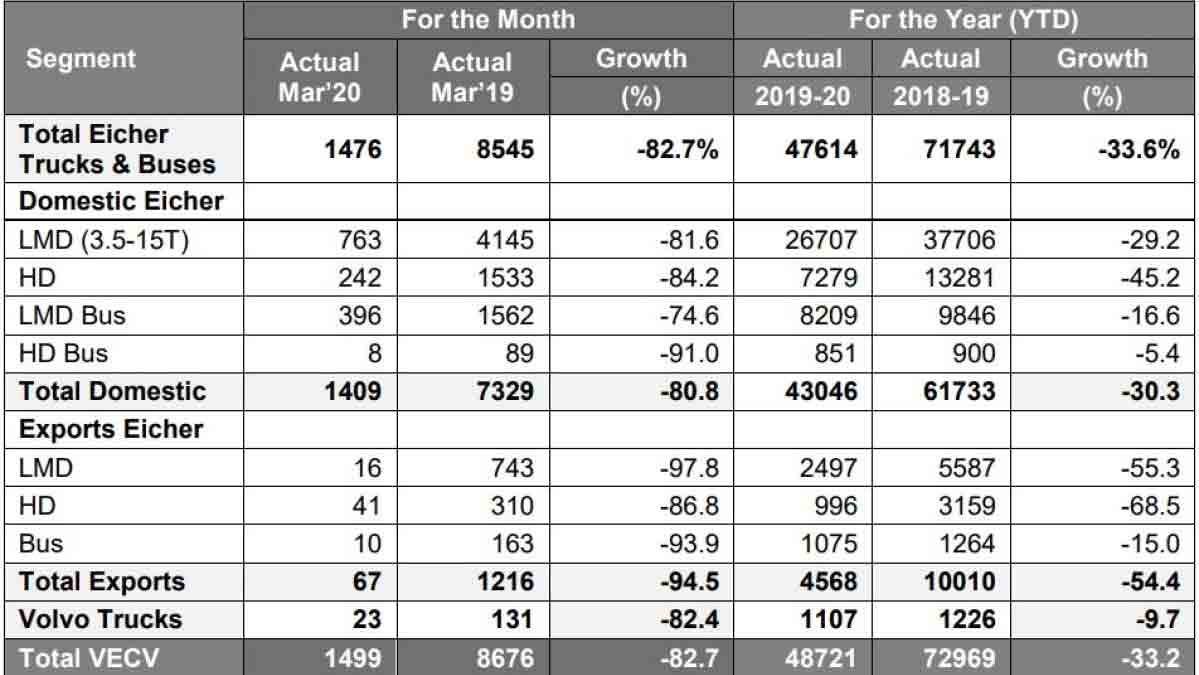 വോൾവോ-ഐഷർ കമേഴ്സ്യൽ വെഹിക്കിൾസിന് കഴിഞ്ഞ വർഷത്തെ അപേക്ഷിച്ച് 17.3 ശതമാനമാണ് വിൽപന നടന്നത്. 82.7 ശതമാനം ഇടിവ് നേരിട്ടു.