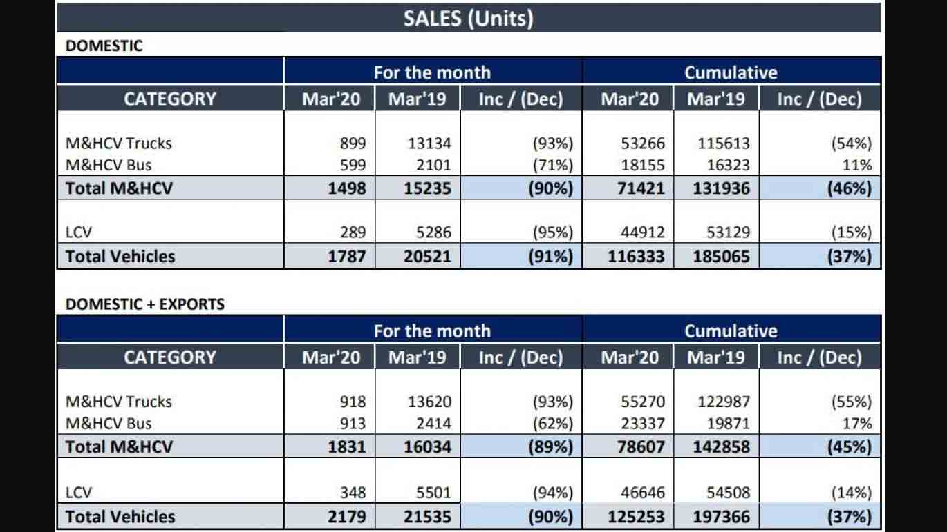 ആഭ്യന്തര വിപണിയിൽ ഇടത്തരം, വലിയ വാണിജ്യ വാഹനങ്ങളുടെ വിൽപ്പന 90 ശതമാനം ഇടിഞ്ഞു. 2019 മാർച്ചിലെ 15,235 യൂണിറ്റിൽനിന്ന് കഴിഞ്ഞ മാസം 1,498 യൂണിറ്റായാണ് ചുരുങ്ങിയത്. ചെറുകിട വാണിജ്യ വാഹന വിൽപ്പന 289 യൂണിറ്റായി. 2019 മാർച്ചിൽ ഇത് 5,286 യൂണിറ്റായിരുന്നു. 95 ശതമാനം ഇടിവ്.