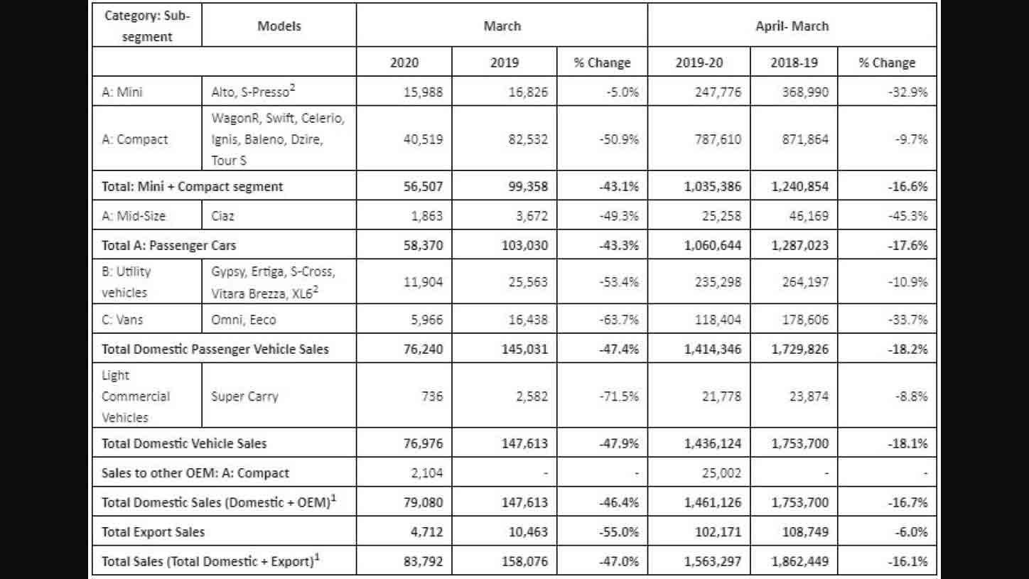 ഇന്ത്യയിലെ ഏറ്റവും വലിയ കാർ നിർമാതാക്കളായ മാരുതി സുസുക്കി ഇന്ത്യ ലിമിറ്റഡിെൻറ വിൽപ്പനയിൽ 47 ശതമാനം ഇടിവ് രേഖപ്പെടുത്തി. മാർച്ചിൽ 83,792 യൂണിറ്റാണ് വിൽപന നടത്തിയത്. കഴിഞ്ഞ വർഷം 158,076 കാറുകളാണ് കമ്പനി വിറ്റത്.