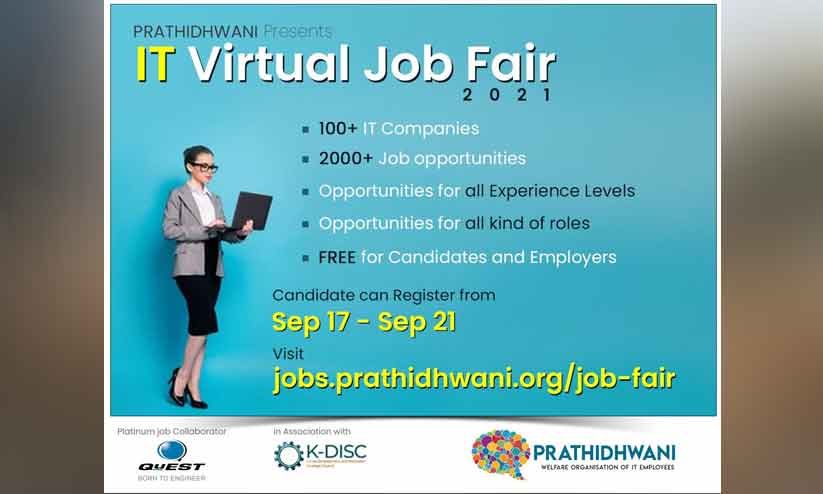 text_fieldsകോഴിക്കോട്: കേരളത്തിലെ ഐ.ടി ജീവനക്കാരുടെ ക്ഷേമ സംഘടന ആയ പ്രതിധ്വനി ഐ.ടി ജീവനക്കാർക്കായി വെർച്വൽ തൊഴിൽ മേള സംഘടിപ്പിക്കുന്നു. െവള്ളിയാഴ്ച തുടങ്ങിയ രജിസ്ട്രേഷൻ സെപ്റ്റംബർ 21ന് അവസാനിക്കും.