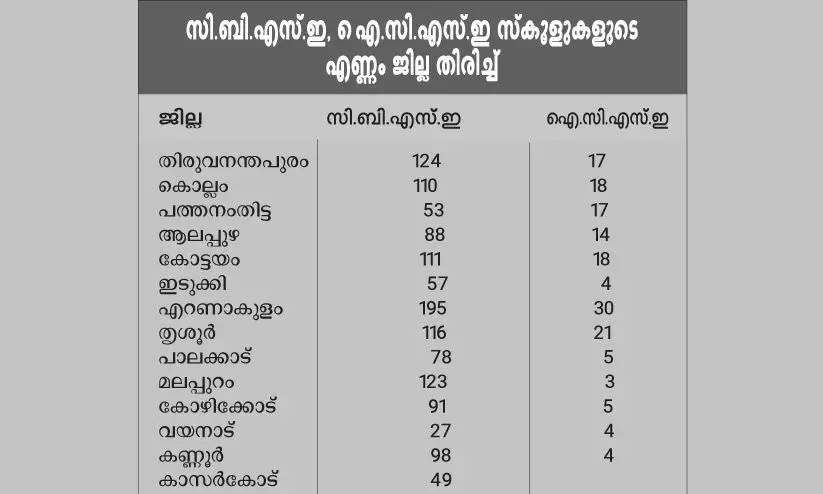 മിക്ക ജില്ലകളിലും സ്കൂളുകളുടെ എണ്ണത്തിൽ വർധനയുണ്ട്. ഏറ്റവും കൂടുതൽ സി.ബി.എസ്.ഇ, ഐ.സി.എസ്.ഇ സ്കൂളുകൾ എറണാകുളം ജില്ലയിലാണ്-195 സി.ബി.എസ്.ഇ സ്കൂളുകളും 30 ഐ.സി.എസ്.ഇ സ്കൂളുകളും. ഇത് 2016ൽ 181, 26 ആയിരുന്നു. സ്കൂളുകളുടെ എണ്ണത്തിൽ രണ്ടാം സ്ഥാനത്ത് തിരുവനന്തപുരം ജില്ലയാണ്-124, 17. 2016ൽ 121, 15 ആയിരുന്നു. മൂന്നാം സ്ഥാനത്ത് തൃശൂർ ജില്ലയാണ്-116, 21. 2016ൽ 106, 17 ആയിരുന്നു.